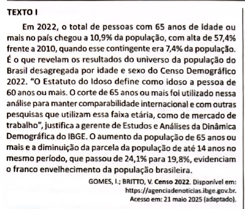 A partir da leitura dos textos motivadores e com base nos conhecimentos construídos ao longo de sua formação, redija um texto dissertativo-argumentativo em modalidade escrita formal da língua portuguesa sobre o tema "Perspectivas acerca do envelhecimento na sociedade brasileira", apresentando proposta de intervenção que respeite os direitos humanos. Selecione, organize e relacione, de forma coerente e coesa, argumentos e fatos para a defesa de seu ponto de vista